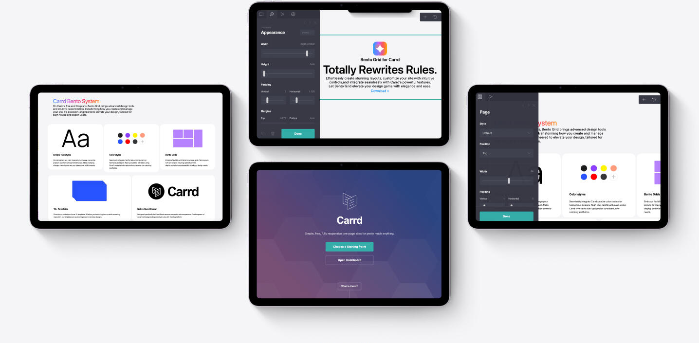 Native Carrd DesignDesigned specifically for Carrd, Bento ensures a smooth, native experience. Feel the power of advanced design tools, perfectly in tune with Carrd's platform.